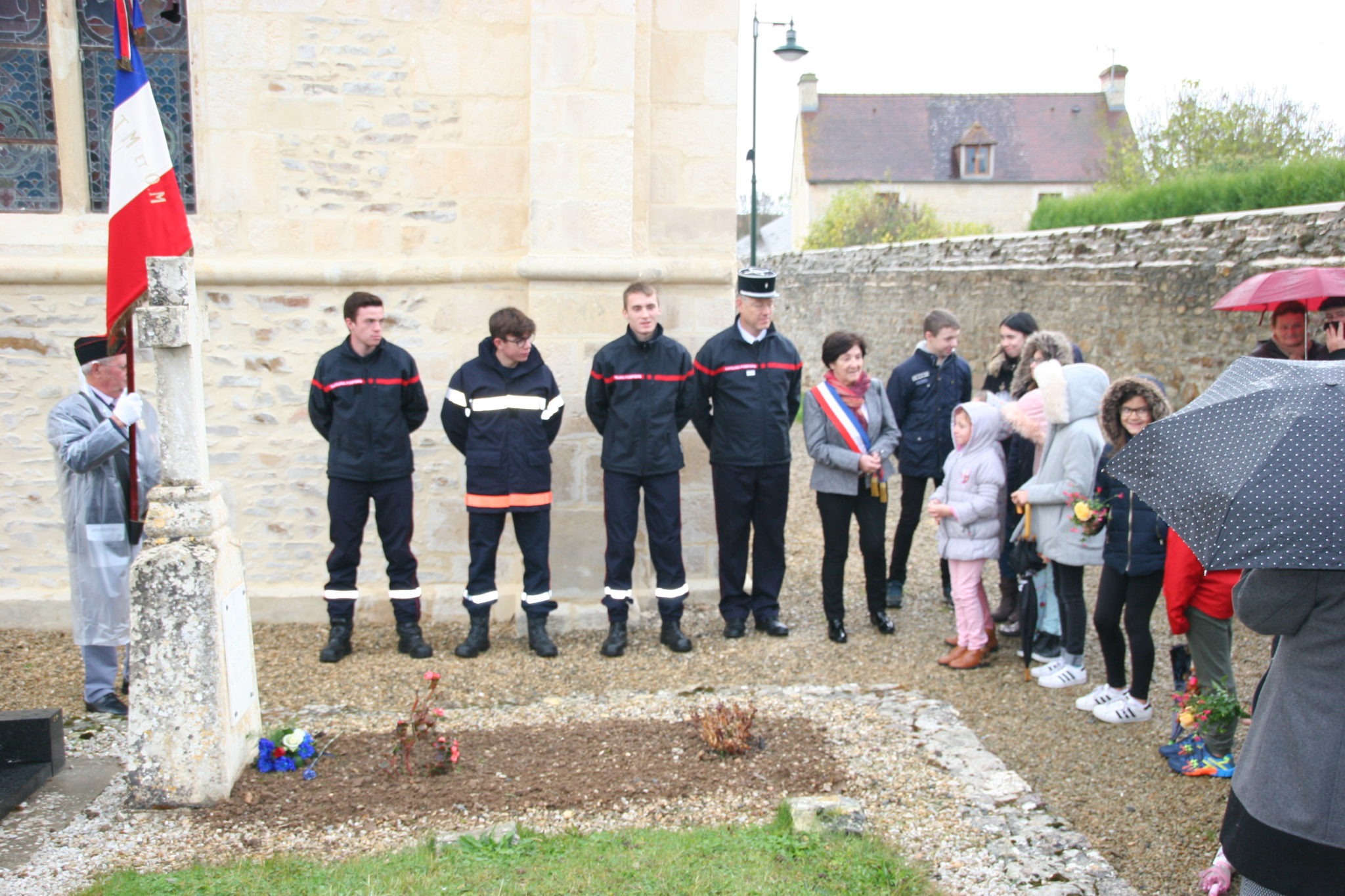Tout d’abord, à 10h30, nous avons accueilli le Lieutenant BONNET et une délégation de pompiers du Centre d’Incendie et de Secours de Bretteville sur Laize qui ont déposé un bleuet sur la tombe de Georges Donatien au cimetière d’Urville, pompier mort pour la France durant les combats en 1916.